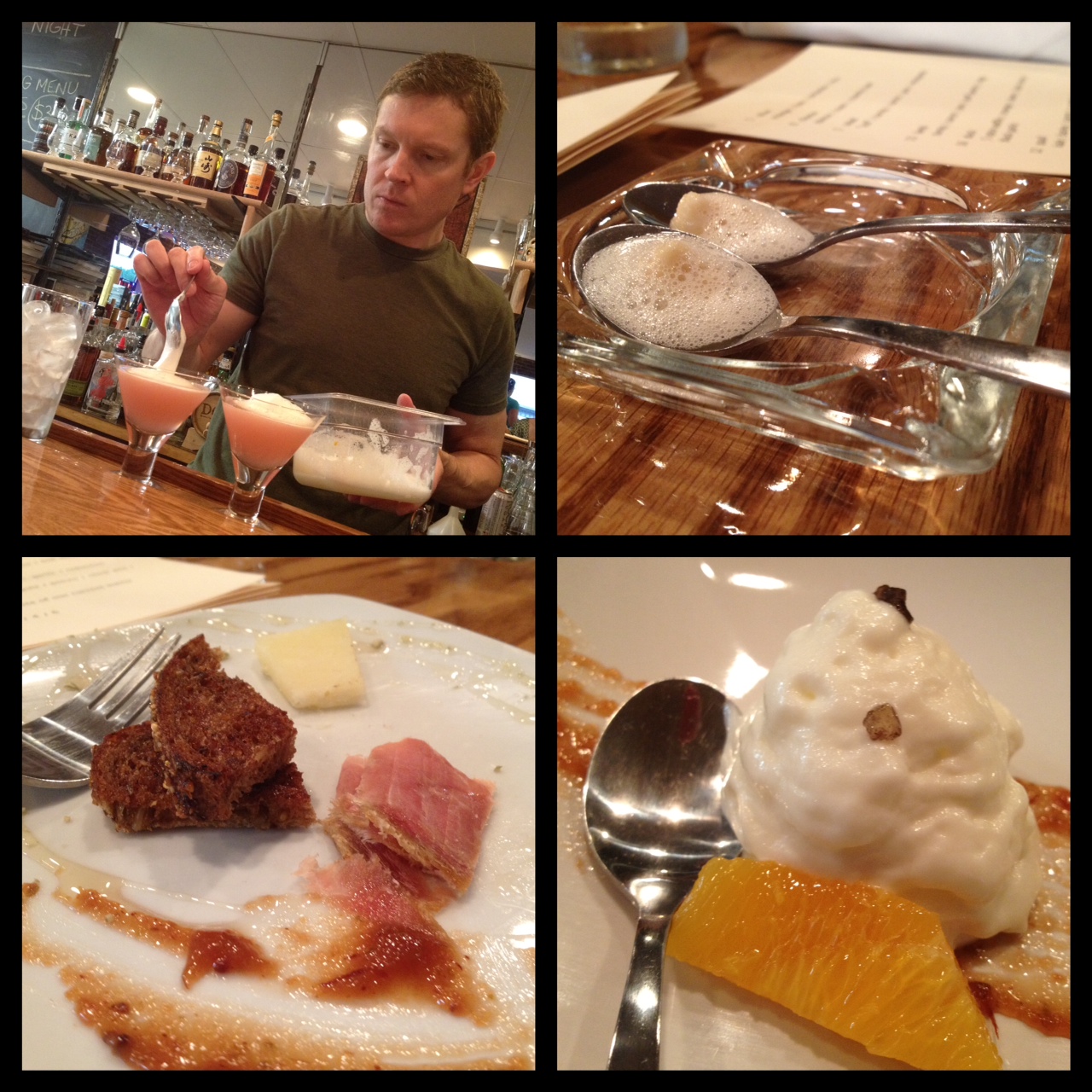 | margaritas with sea foam, parsnip pudding with honey foam manchego cheese with toast, country ham and quince, aerated liquid goat cheese cheese cake with orange, smoked sea salt and quince. |