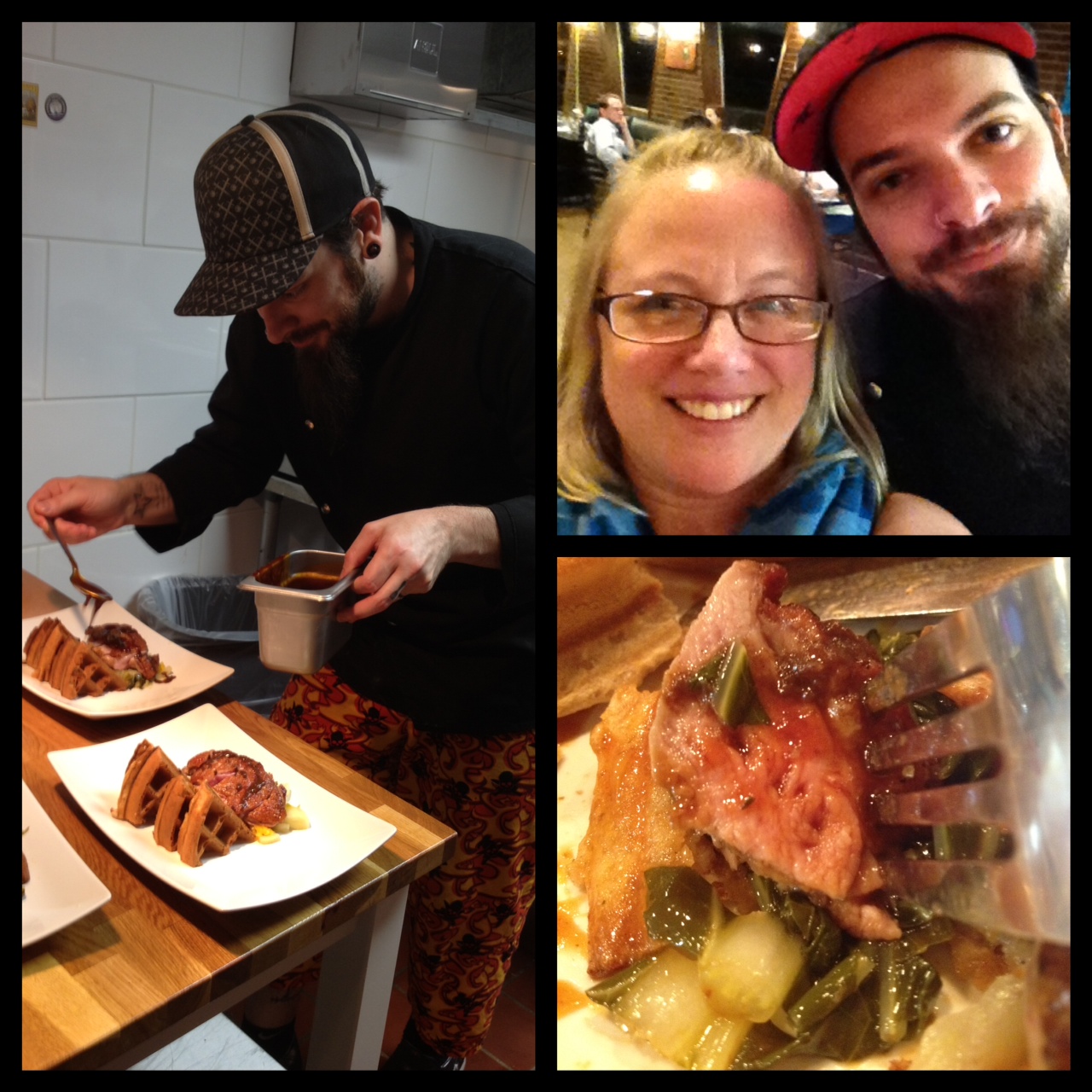 | Chef Aaron Manter puts the final touches on duck with 5 spice waffles with orange demi glaze and bok choy |